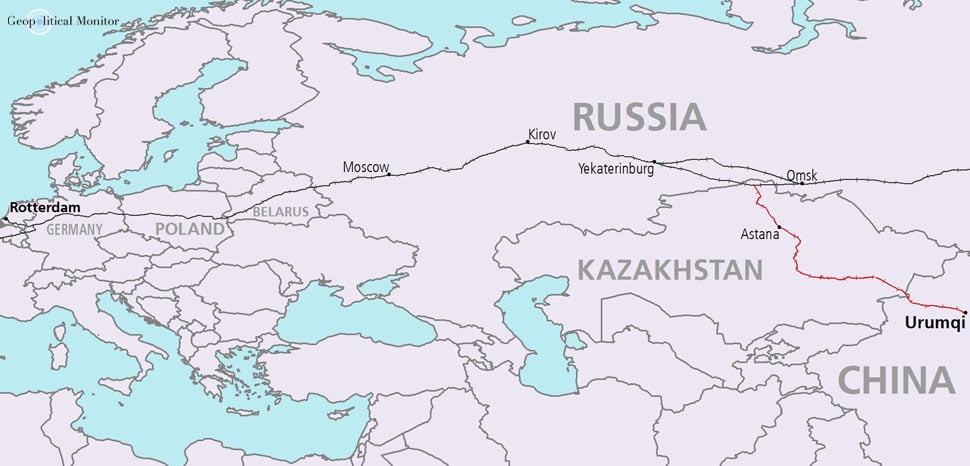 cities like Lianyungang, through Kazakhstan, to European hubs like